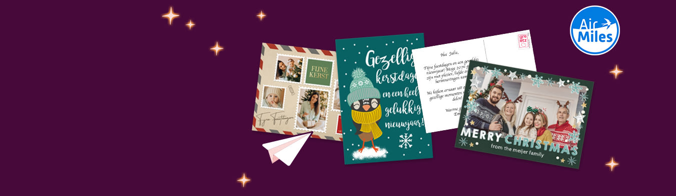De dagen worden kouder en de kerstlichtjes versieren de straten. Het is tijd voor de gezelligste periode van het jaar. En die kan nog wel wat extra warmte gebruiken! Daarom verstuur jij deze winter een kaart via Greetz in samenwerking met Air Miles, met 50% korting. Verspreid de kerstvreugde met één van de magische kerstkaarten uit de collectie of verras voor hun verjaardag, als bedankje of zomaar. Zo bezorg jij deze winter een warm gevoel, door de brievenbus!