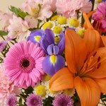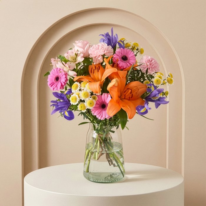 De combinatie van opvallende bloemen zoals lelies, germini’s en speelse accenten maakt dit boeket tot een echte eyecatcher. Ideaal om iemand te verrassen, te feliciteren of gewoon wat extra kleur in huis te brengen.