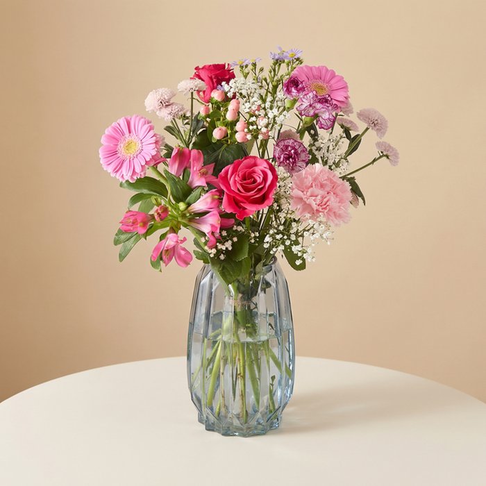 De bijgeleverde vaas maakt het geheel compleet, zodat het boeket direct een mooie plek krijgt. Perfect om iemand te verrassen, te bedanken of een bijzonder moment extra sfeer te geven.
