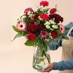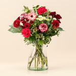 Boeket Gracieus is een warme en stijlvolle mix van rood- en rozetinten, gecombineerd met frisse accenten en elegant groen. De speelse combinatie van bloemen zorgt voor een levendige, rijke uitstraling die in elke ruimte straalt. De bloemsteker in de vorm van een hart geeft het boeket een extra liefdevolle touch, en de Tony's Chocolonely Hartstikke Dol op Jou chocoladereep maakt dat helemaal af. Een prachtig boeket om iemand te feliciteren, te bedanken of gewoon zomaar te laten weten dat je aan ze denkt.
