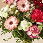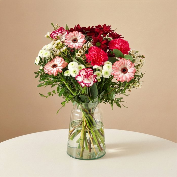 Boeket Gracieus is een warme en stijlvolle mix van rood- en rozetinten, gecombineerd met frisse accenten en elegant groen. De speelse combinatie van bloemen zorgt voor een levendige, rijke uitstraling die in elke ruimte straalt. Een prachtig boeket om iemand te feliciteren, te bedanken of gewoon zomaar te laten weten dat je aan ze denkt.