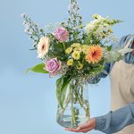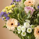 - Bloemsoorten: mix van rozen, gerbera’s, chrysanten, aster, leeuwenbek, gipskruid en diverse groene bladeren.