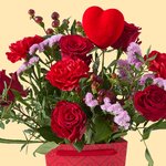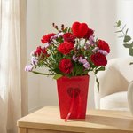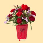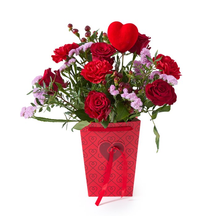 Boeket Tasje Vol Liefs is een speels en liefdevol boeket dat direct een glimlach oproept. De rijke mix van rode bloemen, zachte accenten en fris groen wordt gepresenteerd in een vrolijk rood tasje met hartendetail, wat het boeket een extra persoonlijke uitstraling geeft. Het zachte hart boven het boeket maakt de boodschap compleet: dit is een cadeau vol aandacht en liefde.