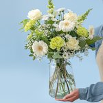 Boeket Waardevol Wit brengt met zijn zachte witte en lichtgroene tinten een serene, frisse sfeer in huis. De elegante mix van bloemen maakt dit boeket geschikt voor allerlei momenten, van felicitaties tot een lief gebaar van aandacht. Samen met de schattige Little Dutch gansknuffel vormt het een hartverwarmend cadeau, perfect voor een geboorte, kraambezoek of zomaar om iemand te verrassen met iets liefs en zachts.
