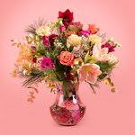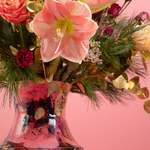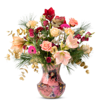 Dit weelderige winterboeket is een echte blikvanger vol warmte en elegantie. De combinatie van zachtroze en dieprode amaryllis, stijlvolle rozen, speelse gerbera’s en rijke wintergroenen geeft het geheel een luxe, feestelijke uitstraling. De subtiele gouden accenten maken het boeket extra bijzonder en perfect voor de decembermaand. Een schitterend cadeau om iemand te verrassen, te bedanken of fijne feestdagen te wensen, of gewoon om zelf in huis van te genieten.