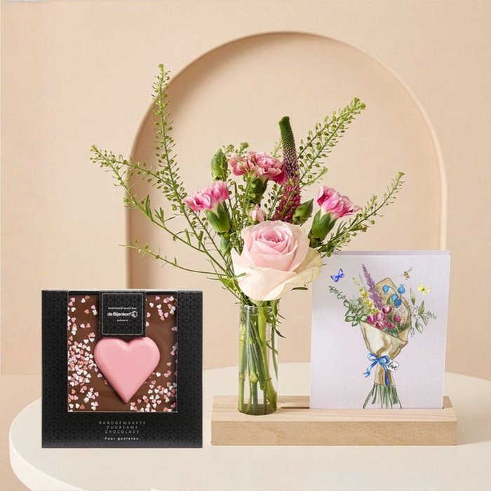 Verras iemand met een liefdevol en compleet cadeau met dit bloemen plankje inclusief chocolade hart. Het stijlvolle houten plankje met een glazen vaasje bevat een elegante bloemenschikking in zachte tinten, mogelijk te combineren met een kaart voor jouw persoonlijke boodschap.
