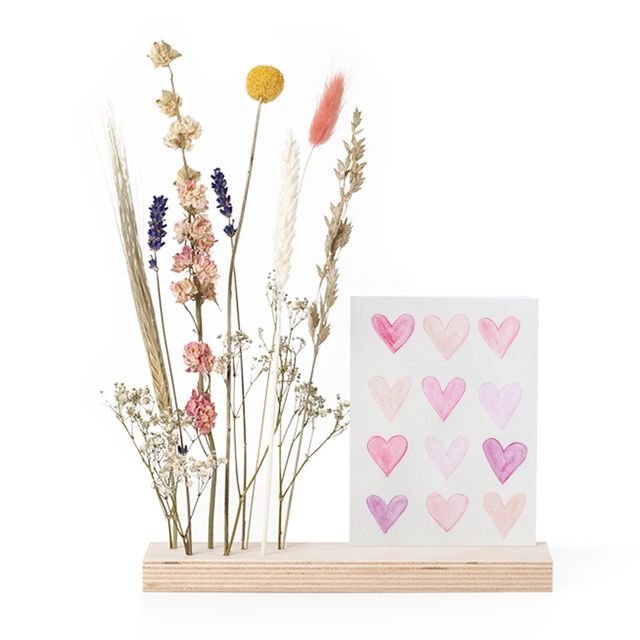 Wil je iemand verrassen met bloemen per post!? Dan kan dat met deze mooie gedroogde bloemen. Droogbloemen zijn een prachtig duurzaam alternatief voor een verse bos bloemen en blijven lekker lang staan op het mooiste plekje bij jou thuis. Dit boeket bevat verschillende gedroogde bloemen en een houten podium waar je de bloemen in kan plaatsen. Ook bevat het houten podium een gleuf waarbij je optioneel jouw gepersonaliseerde kaart kan toevoegen. Zo maak je jouw cadeau persoonlijk en compleet!
