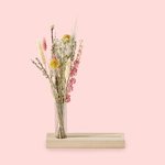 Brievenbus Droogbloemen plankje Bloeiend is een stijlvol en duurzaam cadeau met een natuurlijke uitstraling. De zorgvuldig samengestelde droogbloemen worden gepresenteerd in een glazen buisje op een houten plankje, wat zorgt voor een minimalistisch en modern accent in huis. Zonder water of verzorging blijft dit arrangement langdurig mooi. Dankzij het compacte formaat past het eenvoudig door de brievenbus en is het een perfect gebaar om iemand te verrassen, te bedanken of zomaar een klein stukje natuur cadeau te doen.