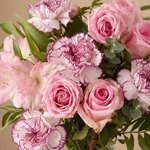 Boeket Charme is een elegant en romantisch boeket met een verfijnde mix van zachte roze tinten en fris groen. De combinatie van sierlijke rozen, speelse bloemen en luchtige accenten zorgt voor een warme en stijlvolle uitstraling die direct een glimlach oproept.