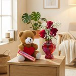 Dit liefdevolle cadeaupakket is perfect om iemand op een warme en vrolijke manier te verrassen. De zachte teddybeer met hartje zorgt direct voor een knuffelbaar gevoel, terwijl de rode rozen met fijn gipskruid een romantische en stijlvolle uitstraling geven. De Tony’s Chocolonely reep maakt het geheel compleet met een heerlijke zoete traktatie.