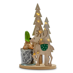 Breng de magie van winter en feestdagen tot leven met deze hyacint in een betoverend houten decoratiestuk. Het vrolijke rendier, omringd door fonkelende lichtjes en winterse dennenbomen, zorgt direct voor een knusse, feestelijke sfeer. Terwijl de hyacint langzaam tot bloei komt en haar zachte geur verspreidt, vormt dit geheel een hartverwarmend wintertafereel dat perfect past op de vensterbank, bij de kerstboom of op de eettafel. Een sfeervol cadeautje dat licht, warmte en een vleugje kerstvreugde in elke ruimte brengt.