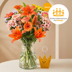 - Bloemsoorten: germini, gerbera, lelie, statice, kleinbloemige chrysant, anjer en eucalyptus (afhankelijk van beschikbaarheid)