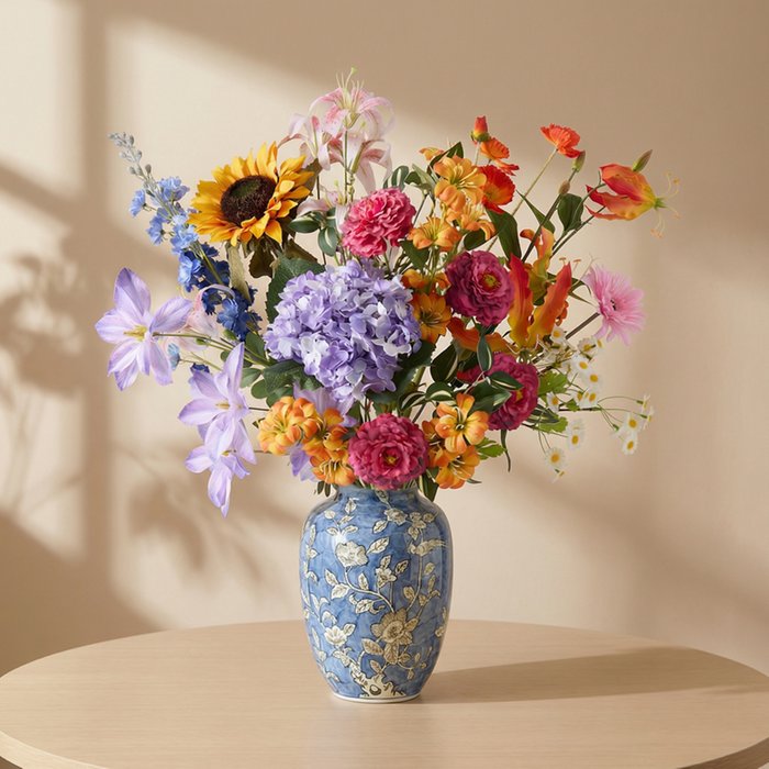 Maak een statement met het Premium zijden kunstboeket Furore. Dit uitbundige boeket combineert een rijke mix van kleuren en bloemsoorten tot een levendige en opvallende compositie. Van zachte pasteltinten tot warme, felle accenten. Furore brengt energie en karakter in elke ruimte.