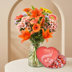 Vrolijk, speels en onweerstaanbaar zoet. Boeket Seizoensstralen met Lindt chocolade in de vorm van een hart is hét recept om iemand op te fleuren. Dit verrassende veldboeket heeft een frisse, levendige uitstraling en brengt meteen sfeer in huis. De bijgevoegde hartvormige doos Lindt Lindor bonbons maakt het cadeau extra bijzonder: een combinatie die zowel het oog als de smaakpapillen verwent. Perfect voor felicitaties, steunmomenten of zomaar een lief gebaar.