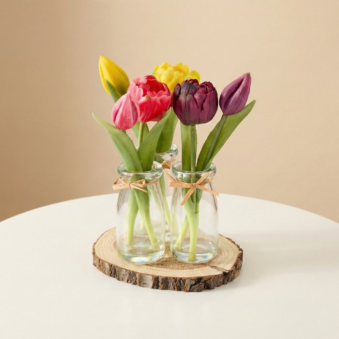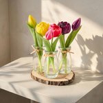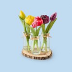 Dit Tulpen Trio bestaat uit drie zijden tulpen, stijlvol gepresenteerd in drie bijpassende glazen vaasjes op een natuurlijke houten onderzetter. Een frisse en vrolijke eyecatcher die perfect past op tafel, vensterbank of bureau en direct een lentegevoel in huis brengt. Ideaal als klein, sfeervol cadeau of om jezelf mee te verwennen.