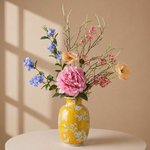 Het zijden kunstboeket Alure straalt elegantie en verfijning uit met een harmonieuze mix van zachte pastelkleuren en natuurlijke vormen. De combinatie van een volle pioenroos, luchtige bloesemtakken en subtiele blauwe en perzikkleurige accenten zorgt voor een speels en stijlvol geheel.