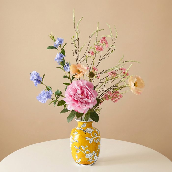 Het zijden kunstboeket Alure straalt elegantie en verfijning uit met een harmonieuze mix van zachte pastelkleuren en natuurlijke vormen. De combinatie van een volle pioenroos, luchtige bloesemtakken en subtiele blauwe en perzikkleurige accenten zorgt voor een speels en stijlvol geheel.