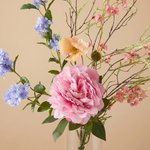 Het zijden kunstboeket Alure straalt elegantie en verfijning uit met een harmonieuze mix van zachte pastelkleuren en natuurlijke vormen. De combinatie van een volle pioenroos, luchtige bloesemtakken en subtiele blauwe en perzikkleurige accenten zorgt voor een speels en stijlvol geheel.