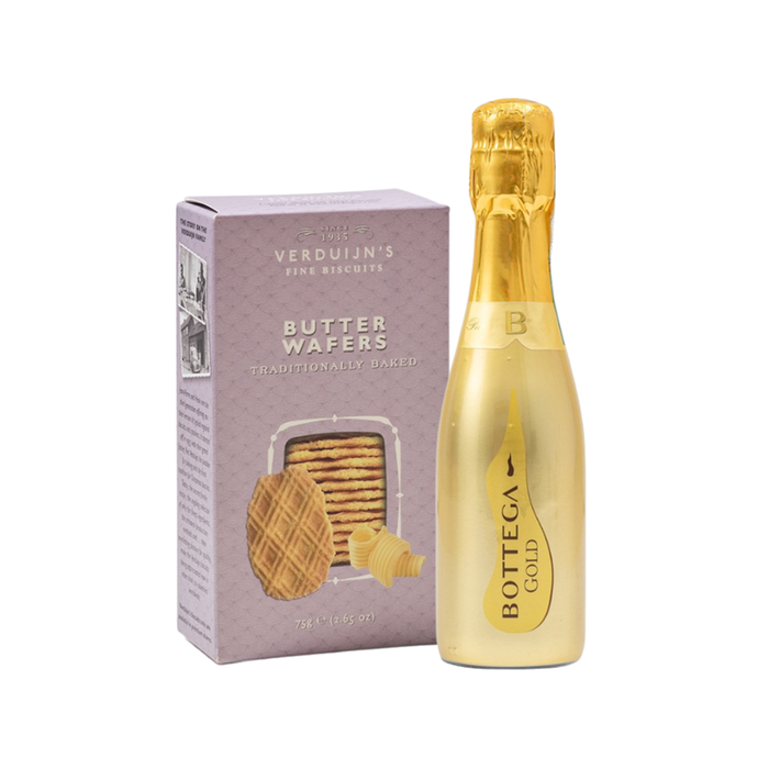 Een feestelijk cadeau om van te genieten. Verras de ontvanger met de frisse en fruitige Bottega Prosecco Gold, een elegante prosecco met een lichte en verfijnde smaak. Combineer dit met de traditioneel gebakken butter wafers van Verduijn’s voor een heerlijk luxe bite. Samen vormen ze het perfecte duo voor een borrelmoment, een toast op iets bijzonders of gewoon om iemand in het zonnetje te zetten.
