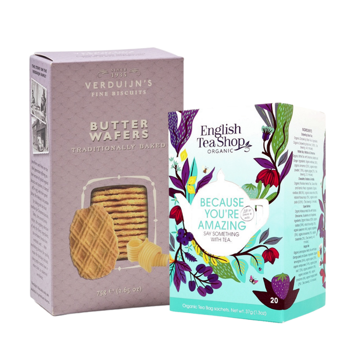 Dit cadeaupakket is perfect voor een rustig en warm theemoment. De verfijnde thee van English Tea Shop nodigt uit om even te pauzeren en te genieten, terwijl de krokante butter wafers van Verduijn’s zorgen voor een heerlijk luxe bite erbij. Samen vormen ze een fijne combinatie om iemand te verrassen met een moment van ontspanning, aandacht en pure verwennerij.