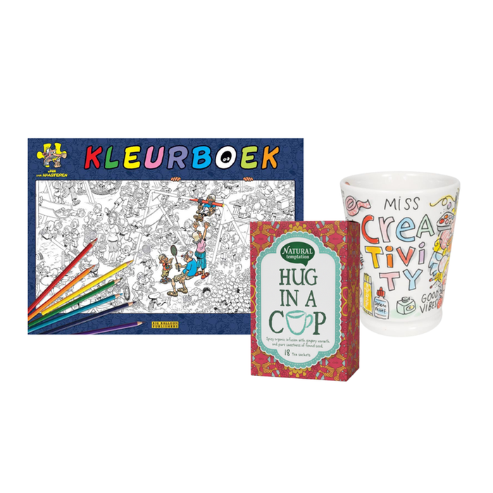 Geef de chaotische wereld van Jan van Haasteren zélf kleur met het kleurboek voor volwassenen en ga op zoek naar de herkenbare details, natuurlijk inclusief de beroemde haaienvin. Met een warme kop biologische Hug in a Cup-thee in de vrolijke XL mok van Blond Amsterdam erbij wordt ontspannen wel héél gezellig. Creatief bezig zijn, genieten van kruidige gember- en venkelthee én even helemaal tot rust komen… dit is hét perfecte cadeau voor echte puzzel- en knutfans.