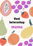 Wenskaart van Greetz ontworpen door Greetz designers, volgens de laatste trends. Voeg je eigen foto('s), tekst, & versiering toe om de kaart extra persoonlijk te maken. Je kunt de kaart toevoegen aan je favorieten of tussentijds opslaan om deze later af te maken. Toch op zoek naar een ander design? Bekijk alle beterschapskaarten. Is jouw moeder ziek? Stuur haar dan een beterschapskaart van Greetz! Op deze kaart staat: veel beterschap mam. De rest van de kaart is versiert met fruit.