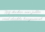 Laat weten dat je aan hem of haar denkt en veel sterkte toewenst. Op de kaart staat de tekst "Wij denken aan jullie veel sterkte toegewenst". Deze tekst kan je ook aanpassen om er wat persoonlijkers van te maken.