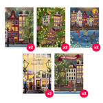 Breng de warme sfeer van de stad in wintertijd naar je kerstwensen met deze prachtige kaartenset! De illustraties tonen sfeervolle (Amsterdamse) grachtenpanden, lichtjes en winterse taferelen. Perfect voor wie houdt van een gezellige, nostalgische kerst.