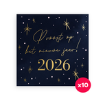 - 10x kaart met donkerblauwe achtergrond, gouden sterren en tekst 'Proost op het nieuwe jaar! 2026'