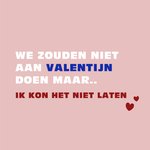 Voor iedereen die niet van Valentijnsdag houdt en er eigenlijk niks aan wilt doen, hierbij de anti valentijnsdag kaart met de tekst: "We zouden niet aan valentijn doen maar.. ik kon het niet laten."