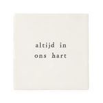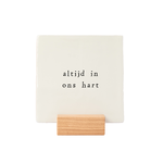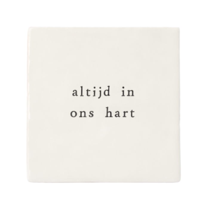 Dit serene keramieken tegeltje met de tekst “altijd in ons hart” is een liefdevolle manier om een dierbare te blijven herdenken. Het minimalistische ontwerp en het houten standaartje maken het tot een mooi, waardig plekje in huis.