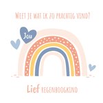 De kaartjes van Kleine Vlindervoetjes zijn gemaakt voor bij het verlies van kind(eren) of een dierbaar iemand. De kaarten zijn zo gemaakt om het afscheid net even iets specialer te maken. Ken jij iemand die tijdens een lastige periode een kindje heeft gekregen? Stuur ze dan een lief geboortekaartje met regenboog voor hun regenboogkindje. Op deze kaart staat: Weet je wat ik zo prachtig vind? Lief regenboogkind.