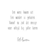 Leuke geboortekaart met tekst. Lief Leven geeft een luchtig filosofische kijk op ons onbegrijpelijke en mooie leven. De teksten zijn positief, simpel en lief. ‘Want daar kan de wereld wel wat meer van gebruiken’ volgens de jonge schrijfster Nanne van der Leer.