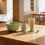 De set bestaat uit een zachte, groen geglazuurde kom, een bijpassende houder voor je klopper, een traditionele bamboe matcha klopper (chasen) in beschermkoker en een bamboe lepel (chashaku). De frisse groene tinten geven de set een rustige, natuurlijke uitstraling die prachtig staat in iedere keuken.