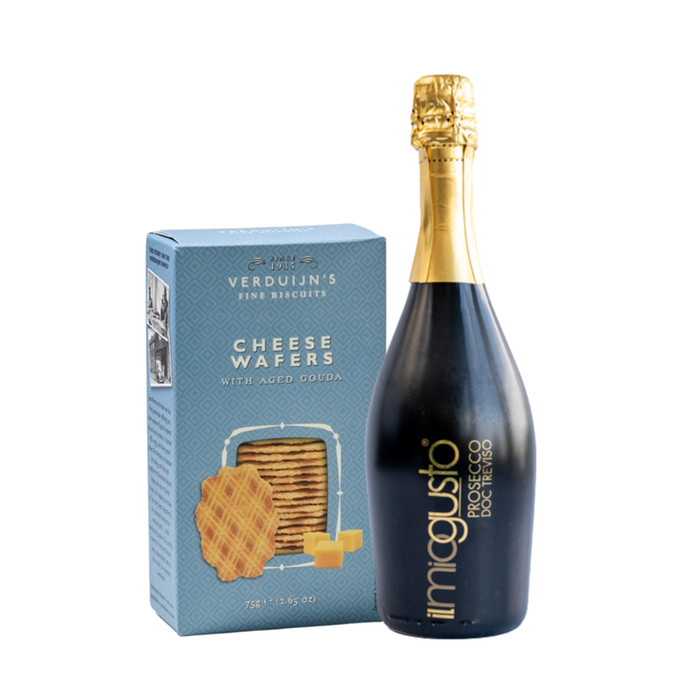 Iets te vieren? Verras met de Prosecco van Il Miogusto en de knapperige cheese wafers van Verduijn’s. De Prosecco DOC Treviso is met zijn zwart-gouden fles een echte blikvanger op elk feest en verrast met een droge bubbel en verfijnde smaak. In combinatie met de hartige, traditioneel gebakken kaaswafels ontstaat een heerlijk luxe borrelmoment. Perfect om te proosten, te delen en samen van te genieten.