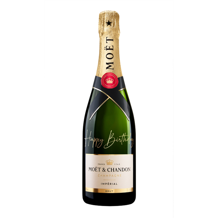 Vier een verjaardag in stijl met deze iconische Moët & Chandon Brut Impérial in een feestelijke Happy Birthday-uitvoering. De tekst is stijlvol in de fles gegraveerd, wat dit een extra bijzonder en blijvend cadeau maakt.