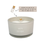 Deze stijlvolle Happy Birthday-geurkaars is het perfecte cadeautje om iemand op een originele manier in het zonnetje te zetten. In het midden van de kaars zit een klein glazen flesje verstopt met daarin een grappige quote: “Birthdays are good for you. Statistics show that the more you have, the longer you live.”