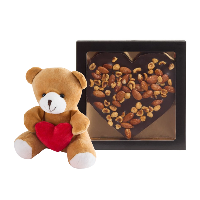 Een verfijnd cadeau dat luxe en liefde samenbrengt. Dit pure chocoladehart van Patisserie de Bijenkorf is een ware traktatie voor de echte chocoladeliefhebber. De rijke pure chocolade wordt gecombineerd met krokant gecarameliseerde hazelnoten en amandelen voor een perfecte balans tussen bitter en zoet. Het zachte pluche beertje, dat een rood hart vasthoudt, voegt een warm en persoonlijk accent toe. Samen vormen ze een elegant cadeau voor een bijzonder moment, om te geven aan iemand die je dierbaar is of om zelf van te genieten.