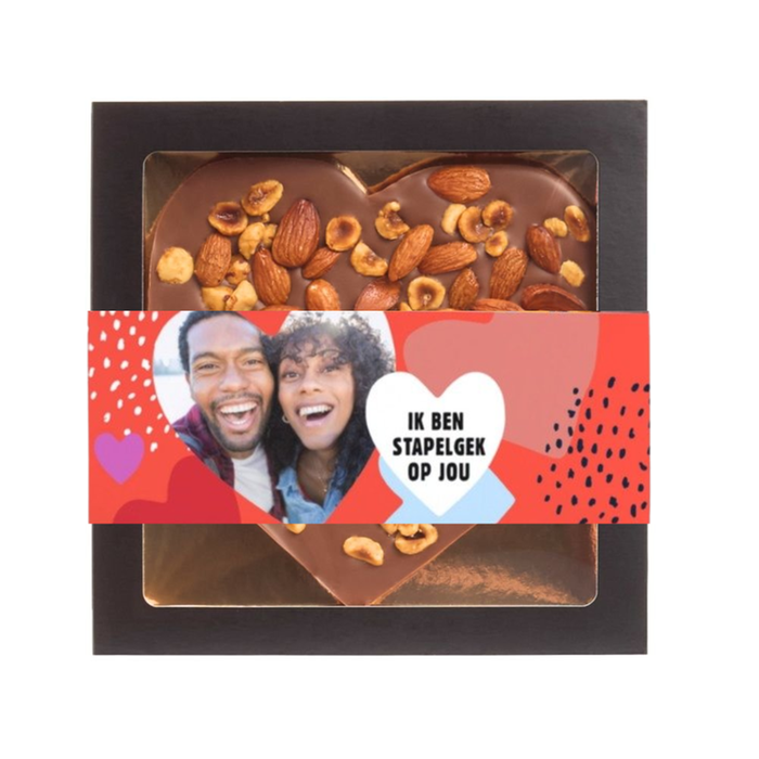 Dit luxe chocolade-noten hart van Patisserie de Bijenkorf is een heerlijk persoonlijk cadeau. Het hart is gemaakt van romige chocolade en rijkelijk gevuld met knapperige noten. De stijlvolle sleeve is volledig te personaliseren met een eigen foto, zodat je jouw boodschap op een unieke en persoonlijke manier kunt overbrengen. Perfect om liefde, waardering of een speciale boodschap te delen bij Valentijnsdag, een jubileum of zomaar.