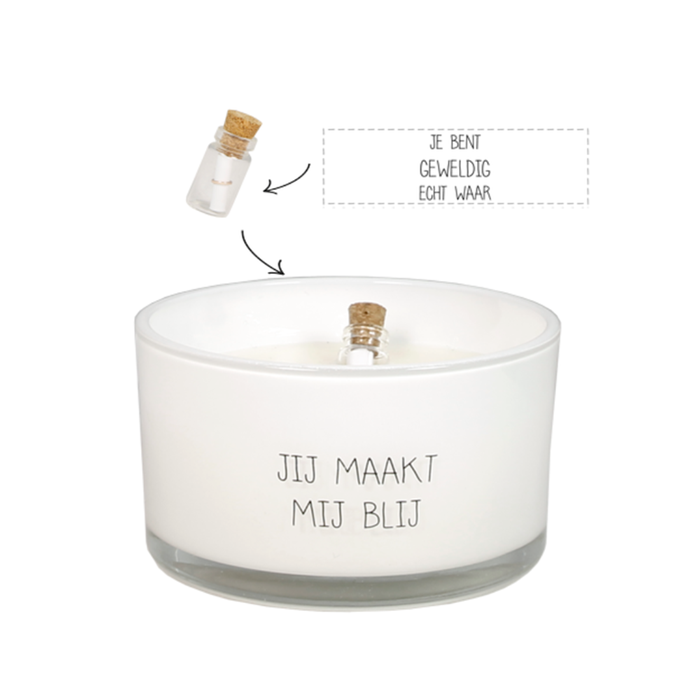 Laat iemand weten hoeveel hij of zij voor je betekent met deze Jij maakt mij blij sojakaars van My Flame Lifestyle. Een liefdevol en persoonlijk cadeau met een warme boodschap die gegarandeerd een glimlach oplevert. De kaars is gemaakt van biologische sojawas en heeft de frisse geur Fresh Cotton: een zachte en comfortabele mix van amber, citrus, lelie en jasmijn met een vleugje muskus.