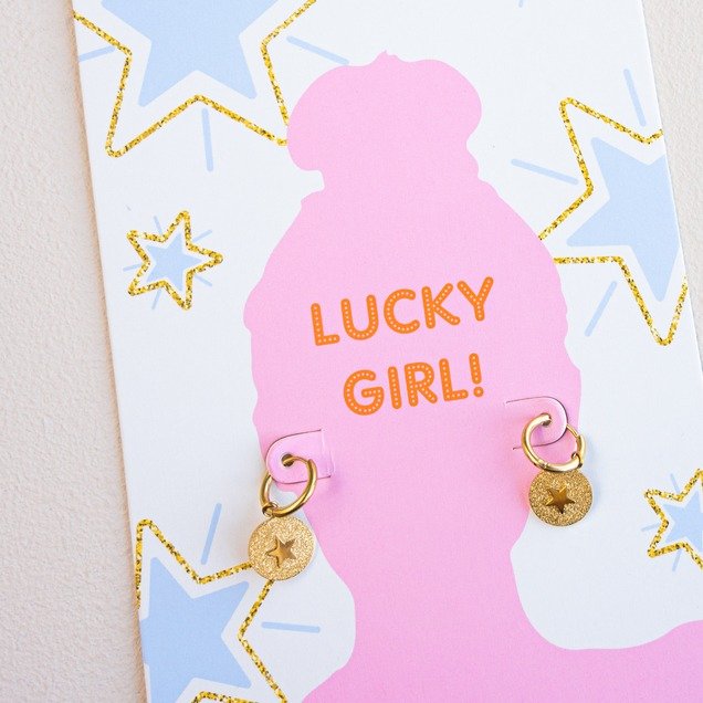 Wie laat jij sprankelen met sieraden? Met dit cadeau zorg je gegarandeerd voor een lach op haar gezicht. Deze oorbellen zijn goudkleurig met een sterretje als hanger. Op het kaartje staat de tekst 'Lucky Girl' op een vrolijke print.