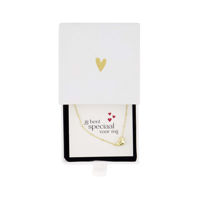 Een tijdloze Zusss ketting met een klein hartje en een grote betekenis. Het gouden hartje staat symbool voor liefde, aandacht en verbondenheid. De ketting wordt geleverd in een wit schuifdoosje met de lieve tekst ‘jij bent speciaal voor mij’, wat dit sieraad extra persoonlijk maakt. Een subtiele manier om iemand te laten weten hoe bijzonder ze voor je is, en een accessoire dat je elke dag dicht bij je hart kunt dragen.