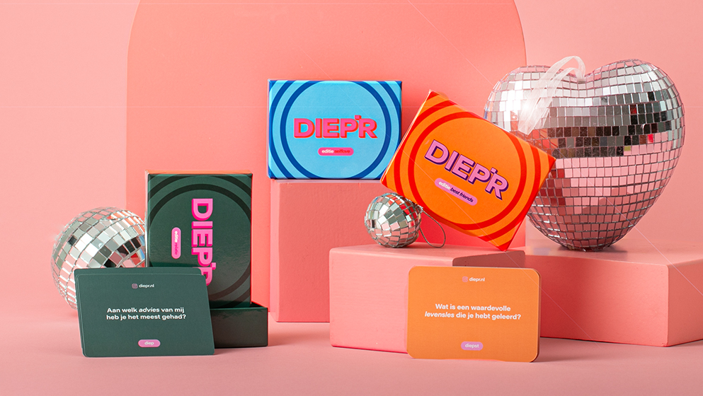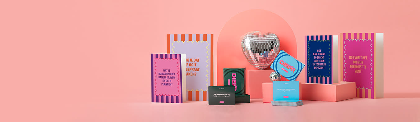 Wil je écht de diepte opzoeken? Verras vanaf nu met de kaartspellen van DIEP’R: het populaire kaartspel dat zorgt voor échte gesprekken. DIEP’R is een kaartspel vol verrassende, persoonlijke vragen. Het daagt je uit om stil te staan, te luisteren en écht in gesprek te gaan. Of je nu samen aan tafel zit, op afstand contact houdt of gewoon een mooi moment wilt creëren: met DIEP’R kom je tot gesprekken die je niet snel vergeet. Van kaartspellen voor relaties, vriendschappen, kids, trouwen óf voor als er een baby aankomt: er is voor elk moment wel een variant.