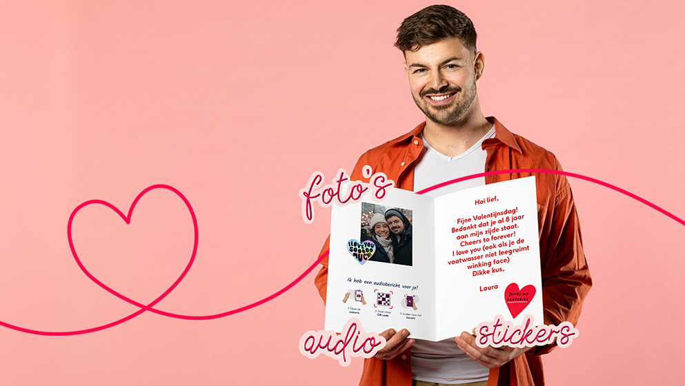 Met jouw unieke kortingscode kun je één gratis standaard formaat kaart bestellen, met een maximale waarde van € 3,79, inclusief postzegel t.w.v. maximaal € 1,40. Wil je je verrassing extra speciaal maken? Voeg dan een valentijnsballon toe met 20% korting (automatisch verrekend). Let op: de gratis postzegel wordt alleen toegepast bij een kaart bestelling. Zodra je een valentijnsballon toevoegt, betaal je de reguliere bezorgkosten.