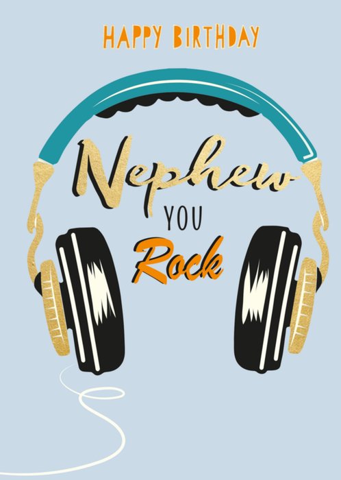 Leuke verjaardagskaart met illustratie van een koptelefoon en de tekst: Happy birthday nephew you rock