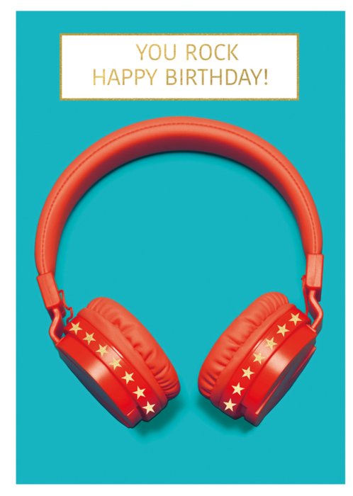 Leuke verjaardagskaart met koptelefoon en de tekst: You rock happy birthday!