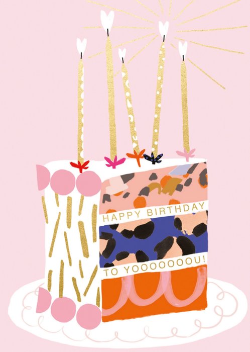 Smakelijke verjaardagskaart met taart illustratie en tekst.