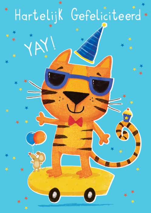 Stoere verjaardagskaart van een tijger op een skateboard en de tekst: Hartelijke gefeliciteerd yay!