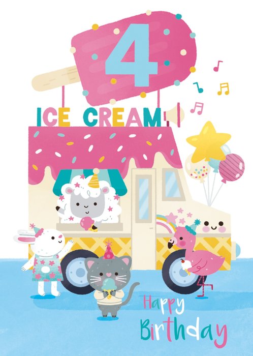 Een vrolijke en kleurrijke geïllustreerde 4de verjaardagskaart met een ijskar die heerlijke traktaties uitdeelt. Schattige dieren, waaronder een schaap, konijn, kat en flamingo, vieren feest met feesthoedjes, ballonnen en ijsjes. Het grote roze ijsbord toont het nummer "4", waardoor dit de perfecte kaart is voor jonge kinderen die dol zijn op ijs en feestelijke vieringen.