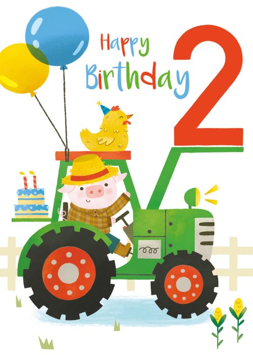 Een vrolijke geïllustreerde 2de verjaardagskaart met een gezellige boerderijsfeer. Een schattig varkentje met een hoed bestuurt een felgroene tractor, terwijl een feestelijke kip erbovenop zit. De kaart is versierd met ballonnen, een verjaardagstaart en een grote rode nummer "2". Perfect voor jonge kinderen die van boerderijdieren en tractors houden.